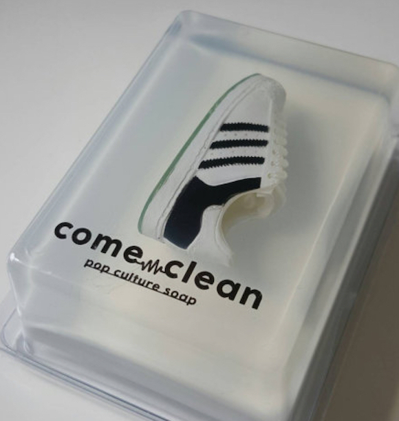 到目前为止,Come Clean一共设计了40款内嵌不同款式、不同品牌球鞋的手工皂,选取的球鞋多为大热款,即使不是限量款也一定是潮流爆款,或是品牌经典款。比如,除了Nike Air Jorden系列的不同代球鞋,Come Clean也内置了Adidas的三条杠经典款Superstar。