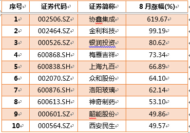 8月A股市场剧烈震荡下行之后,绝大多数上市公司损失惨重,跌幅40%以上的有70家,50%以上的有19家,浩丰科技(300419.SZ)跌幅达60%。股价上涨的公司相对很少,仅有不到一成。其中,增幅40%以上的有21家,50%以上的只有8家。协鑫集成(002506.SZ)以619.67%的涨幅位居第一,金利科技(002464.SZ)、银润投资(000526.SZ)、梅雁吉祥(600868.SH)的表现也很抢眼,涨幅都在70%以上。