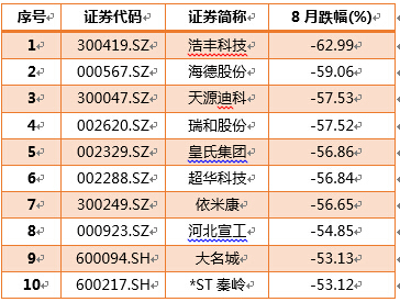跌幅榜中,浩丰科技跌幅最甚。作为营销信息化解决方案提供商,浩丰科技今年1月登录创业板,之后3个月便宣布停牌,拟发行633万股,集资7.45亿元用于收购路安世纪100%股权,但其收购估价比账面净资产溢价高出了超30倍。或出于对高溢价的担忧,浩丰科技8月14日复牌之后,从214.4元/股跌到31日的88.99元/股。