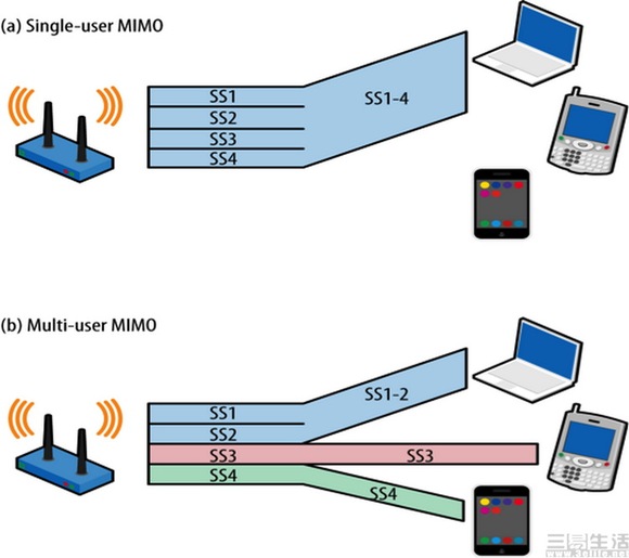 当然,3T3R天线配置,同时主控更新,对于这样的路由器来说,它们的另外一个好处就是基本都能支持MU-MIMO了。这个技术大家可以理解为将多天线“拆分”给不同的设备来用,比如说一台双天线的电脑和一台单天线的手机,如果是前面讲到的低端2T2R路由器,延迟就已经变成两倍了。但是新主控的3T3R路由器则可以通过工作在1T1R+2T2R模式下,同时满足两台设备上网,延迟还不会变大。