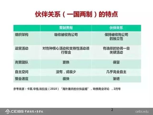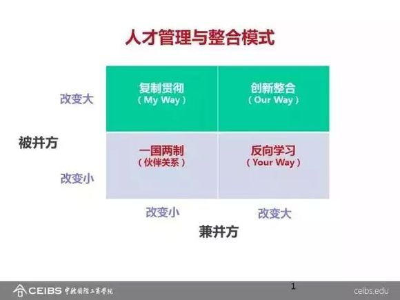 我们总结一下,在并购中存在几种不同的类型,有的时候被并购方变化很大,或者变化很小,有的兼并方变化小或者变化大。根据不同的类型,分为复制贯彻、创新整合、反向学习和一国两制(伙伴关系)。中国企业的海外并购,理想化是最后都要走到这种一国两制的伙伴关系,走这条路有希望吗?希望不大,因为我们很多走出去的企业自己还没搞清楚,风险很大。蛇吞象需要把海外好的东西学过来。