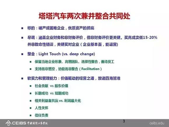 此外,塔塔对大宇整合是一个渐进式的整合,而不是上来全部推翻,并且承诺三年不减员。还有很重要的一点是,对大宇的经营采取支持而不是管控的态度,对大宇一些新的项目持续给予资金的支持,让韩国人很高兴,把他们现在开始的研发项目都做完了。