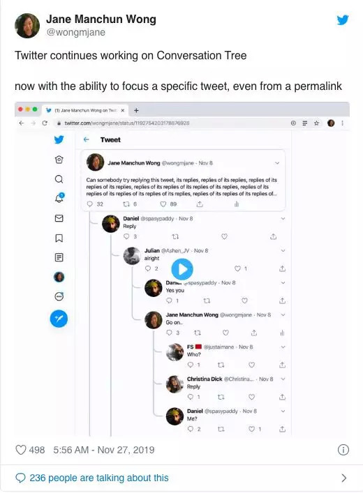 著名的逆向工程师 Jane Manchun Wong发现了Twitter.com上正在开发的对话树布局,与twttr上的对话树布局相同。
