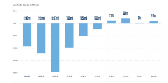 资本带来的效果是明显的,同时也带来了争议,曼城成为了人们口中的土豪球队和金元足球代表,对于豪门的称呼更多的称呼是“壕门”。也是这样不计回报的投入,曼城的利润额一直都是负数,特别是2010-11赛季,利润为-1.97亿英镑(亏损),达到亏损之最。欧洲足坛的这一现象引起了欧足联的重视,最终财政公平法案出炉,之后曼城和巴黎圣日耳曼成为了出头鸟,双双被罚6000万欧元,并且被要求降低工资水平、限制单笔交易最大额。