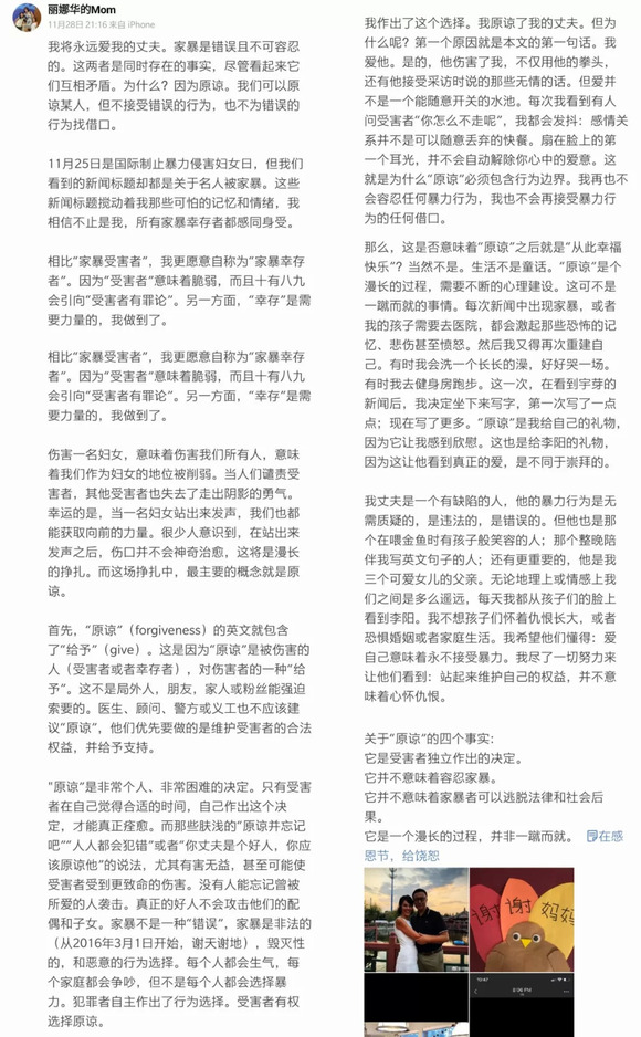 她决定原谅了他,并且放了多张李阳与她和子女们一起的温馨家庭照。