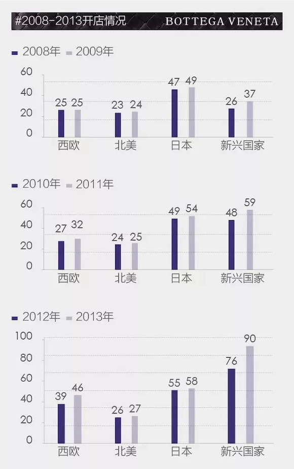 与此同时,这个德国人明白奢侈品华丽的形象背后需要哪些不露声色的商业运作才能支撑。他为 BottegaVeneta 在纽约、巴黎、伦敦和米兰设计了富丽堂皇的旗舰店,之后又一手打造了 BottegaVeneta 的第一个 Maison。在过去 5 年中,Bottega Veneta 一方面在设计上回归低调、复古,另一方面却把这些产品放在了越来越多国家不断建立起来的新门店中。和门店数字一同增长的还有它的营收和利润,最近 3 年的平均增长率都高达 30%。