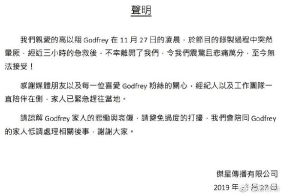 11月27日凌晨,中国台湾艺人高以翔在参加浙江卫视《追我吧》节目录制过程中,不幸去世。医院最终宣布为心源性猝死。
