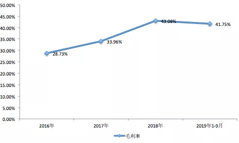 毛利率也是持续上涨,由2016年的28.73%持续上涨到2019年前三季度的41.75%,为近十年同期毛利率最高值;