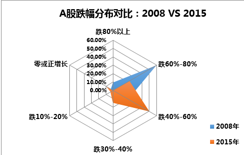下图是界面新闻统计的所有个股在2008年和2015年暴跌中的跌幅分布。可以看出:2008年近70%的个股跌幅超60%,其中更有9%跌幅超80%;不同于2008年,2015年仅有22%的个股下跌超60%,近一半下跌40%-60%。总的来说,2008年个股大面积跌破60%,而2015年则大多下跌40%-60%,属于中等跌幅。这在一定程度上也说明了,今年A股的暴跌仍未达到市场的极限,仍有下行空间。
