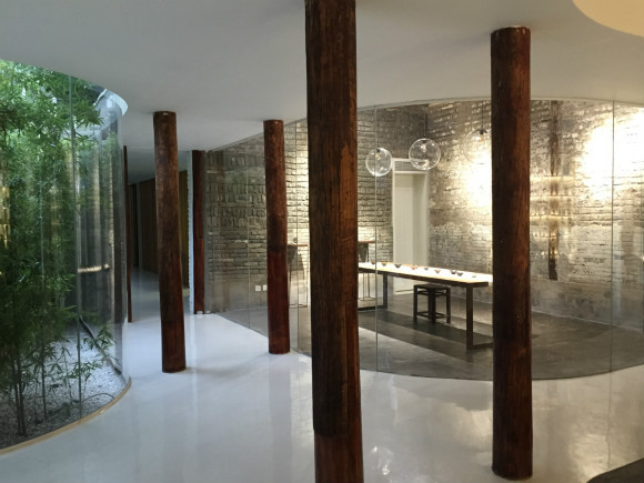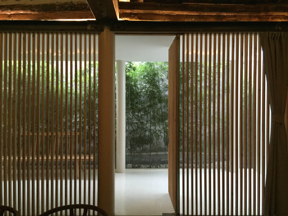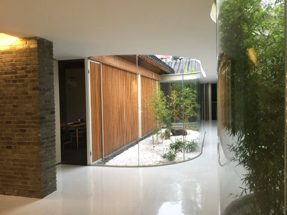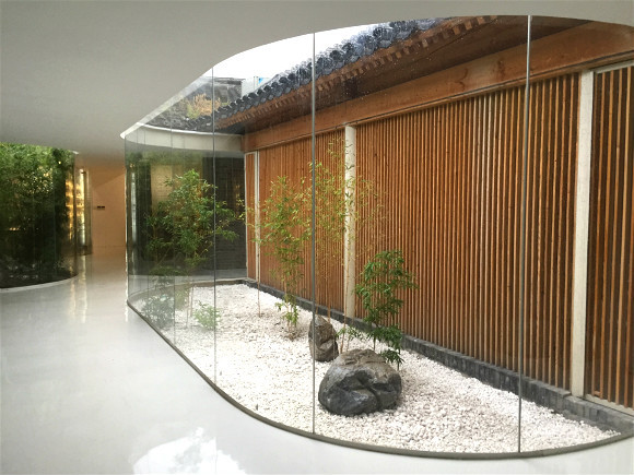 据韩文强介绍,在北京,常见的四合院改造做法是用玻璃封顶。但由于这件茶室的院子不规整,封顶后可借用的空间还是太有限,并且会损害原来四合院中开放的自然环境,最后,茶室选择留出开放的院子空间,用鱼缸材质的玻璃将院子和室内隔开。院子里种上了竹子,屋檐下安装有显性的排水系统。这样下雨的时候,人们就可以隔着玻璃,欣赏雨水从灰色屋檐倾泻而下的小瀑布,落下的水还能用来浇灌竹子。