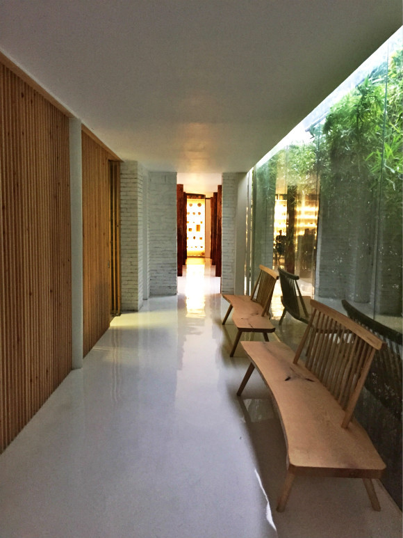 为了使游廊更加顺畅,廊子的设计中不宜有太多柱子,因此,整个廊子用钢结构框架加固,屋顶选用了12公分的整板材料,没有梁,这样也能保持屋顶在无柱子的状态下能够看起来更加轻盈。
