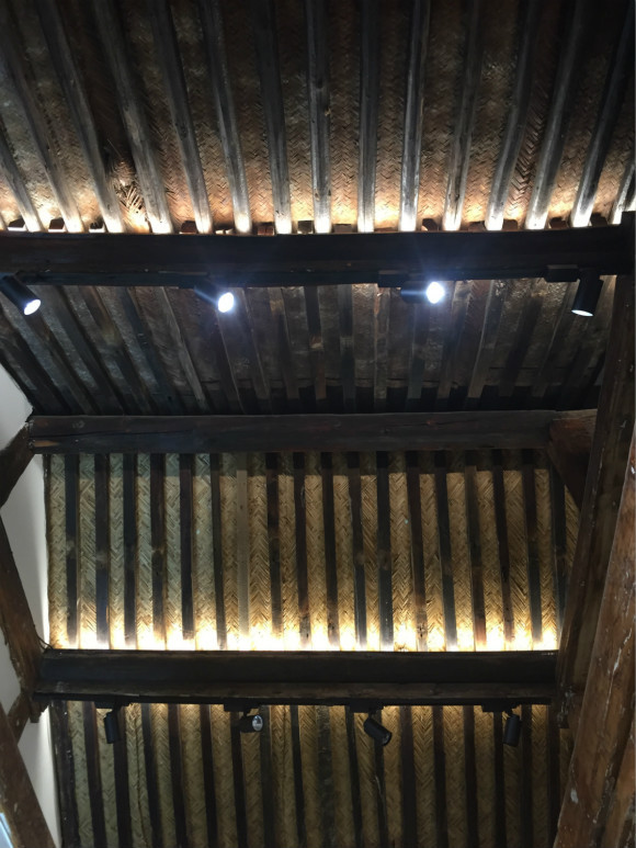 整体来看,水墨轩茶室的新和旧的部分是很明确的。廊子部分是全新的,而除此以外的其他部分是经过修缮的旧院,抬头一看,旧屋顶和经过补漏的屋顶颜色有差,而旧院中有很多实木柱子。一些柱子底部也被填补过,但经过粉刷看不出色差。以前老房子用的金砖是用太湖的泥烧制,但价格太过昂贵。所以茶室用来修缮的砖用的是常规灰砖。设计团队将灰砖裁成两半,先铺在地上,先刷上清漆,再刷上桐油,经过几道工序,将它们做成了表面光滑的地表。这样就可以在节约成本的基础上也不损害整体的美观。