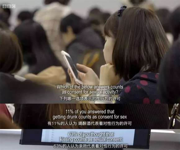 在一次课堂调研中,有11%的学生认为喝醉酒代表了对性行为的认可,而63%的学生认为亲吻代表着对性行为的认可。
