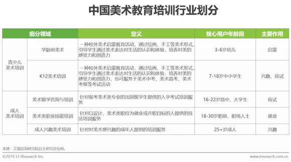 本报告所研究的美术教育培训行业特指发生在校外/课外的、运用各种教学手段进行美术相关的教育培训活动的市场行为,按教学内容和用户年龄段的不同可分成青少儿美术教育和成人美术培训两大领域,覆盖用户全生命周期。