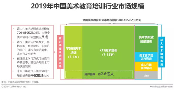2019年总体市场规模在900-1050亿元之间,超八成为青少儿美术,未来青少儿美术有望成为千亿市场
