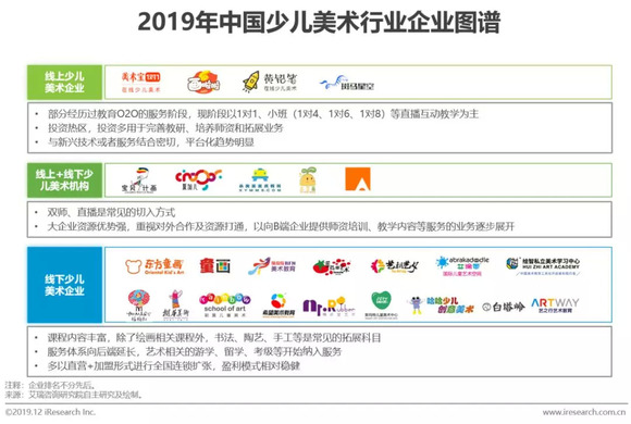 少儿美术培训市场:线下机构多以直营+加盟方式运营,其中代表性机构的校区数量普遍达数百个,正在全国性扩张;线上企业创新性强,更受资本青睐,代表性机构学员数已达数万人。