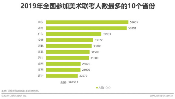 山东、河南是人口大省,也是美术高考大省,2019年仅参加美术联考的人数就有将近6万。广东、江苏、四川三省2019年参加美术联考的人数虽然也高达3-4万人,但综合三省的人口总数来看,参加美术联考的考生比例相比于其他省份来说仍然较低,即经济越发达的地区,对美术高考的热衷程度相对越低。