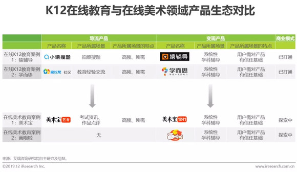 美术是整个在线教育行业中发展较晚的一个品类,目前还处于初步发展阶段,我们可以通过对比其他发展较早的在线教育品类,来推演在线美术的发展路径。以K12在线教育为例,猿辅导和学而思分别通过小猿搜题和家长帮来实现原始用户积累,再通过猿辅导和学而思培优来实现课程变现,导流产品为变现产品降低了获客成本,提高了数据化教研和精准推荐的能力。在线美术行业发展路径类似,目前美术宝、美院帮等企业已推出自己的导流产品,美术宝、画啦啦等企业已推出自己的变现产品,未来行业内将出现几家企业,像猿辅导和学而思一样,打通在线业务的商业模式。