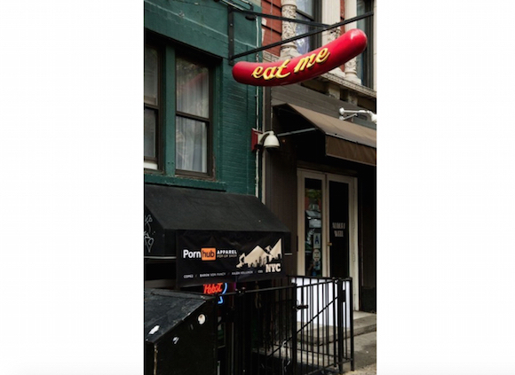 这个纽约胶囊系列是由纽约当地的数名艺术家利用涂鸦、纹身等纽约当地元素,并结合Pornhub的特点所做出的设计。而为了更好地为该系列以及自己的新业务造势,Pornhub还在纽约曼哈顿区一家热狗店里开出了一家临时线下展示商店。