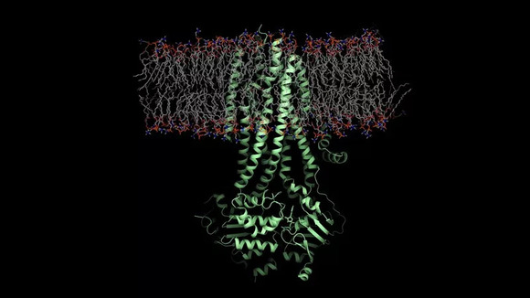 在细胞表面的囊性纤维化缺陷的CFTR蛋白的模型(绿色)