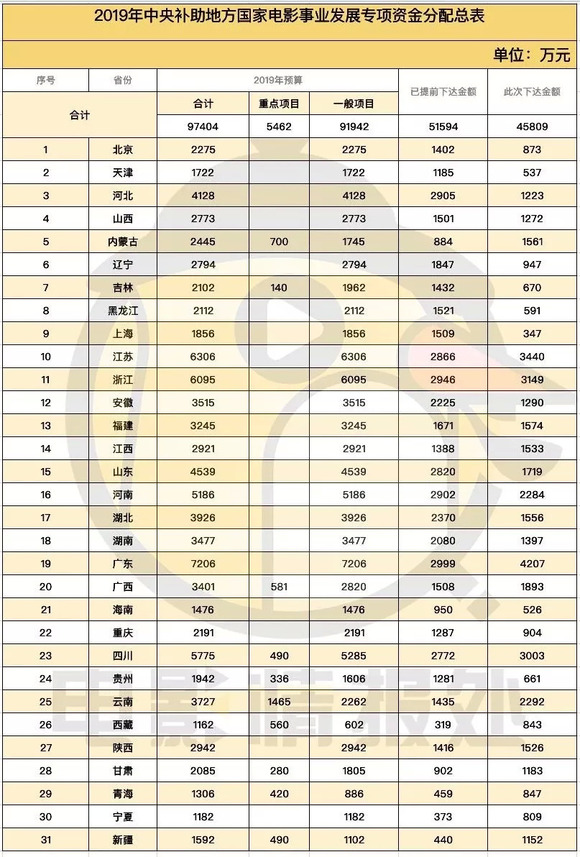 去年全年票房接近607亿,电影事业发展专项基金的数额达到30亿,根据相关规定,这其中40%将回归到地方,今年7月,财政部已经下达了2019年补助地方国家电影事业发展专项资金,金额为9.74亿元。