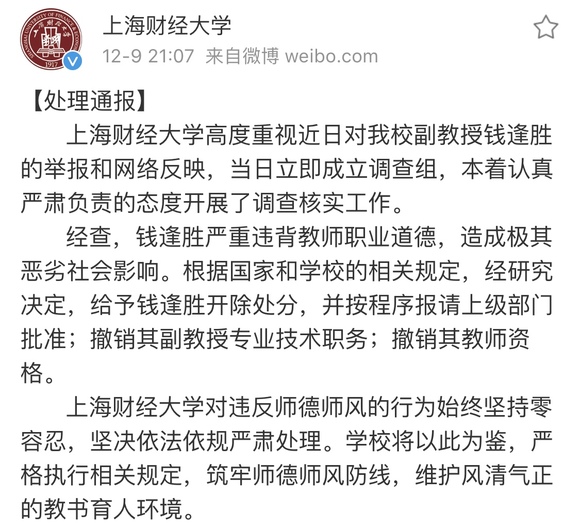 与之类似的事情一直在发生。12月6日,微信公众号“莫愁江湖”发布举报信称,上海财经大学会计学院副教授钱逢胜不但通过微信多次向女学生发送极其暧昧的信息,还在校园里将女学生锁在车内进行性侵,事后还继续展开性骚扰。12月9日晚,上海财经大学宣布开除钱逢胜,并撤销其副教授职务与教师资格。