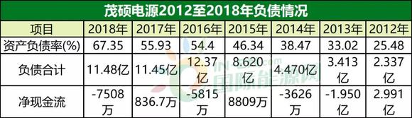 与股东减持高管涨薪相对应的是,茂硕电源的资产负债率也在随之不断提高,2012年上市当年的资产负债率只有25.48%,截至2018年底,公司资产负债率提升至67.35%,负债总额也从2012年上市之时的2.279亿提高到2018年底的11.48亿,几乎翻了五六倍。公司的净现金流也从最初上市时的2.991亿元降至-0.75亿元。