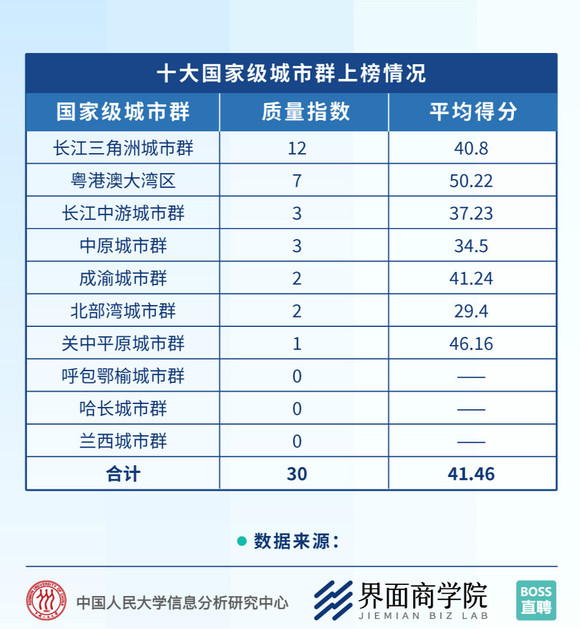 人才吸纳度在区域表现上差距显著。报告显示,从城市群的角度来看,十大国家级城市群覆盖了前50强中的30座城市,覆盖度达到60%。长三角与粤港澳大湾区的上榜城市数量显著超出其余城市群,平均得分也处于城市群前列,且粤港澳城市平均得分显著高于长三角城市。