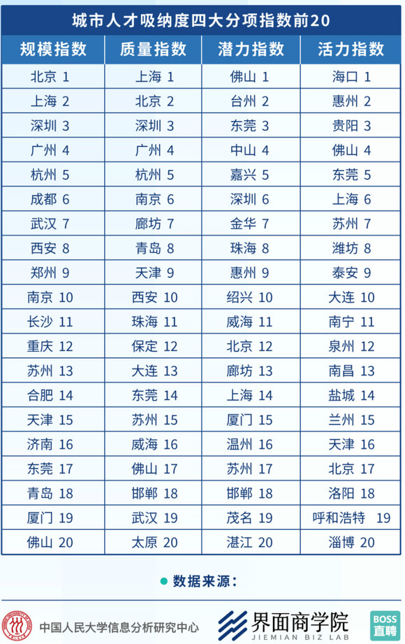 在12月26日举行的“2020界面·财联社财经年会”上,界面商学院联合中国人民大学信息分析研究中心和BOSS直聘发布了《从抢人到留人——2019中国城市人才品牌吸纳度50强报告》,对各地吸引和接纳人才的效果进行了综合评估。