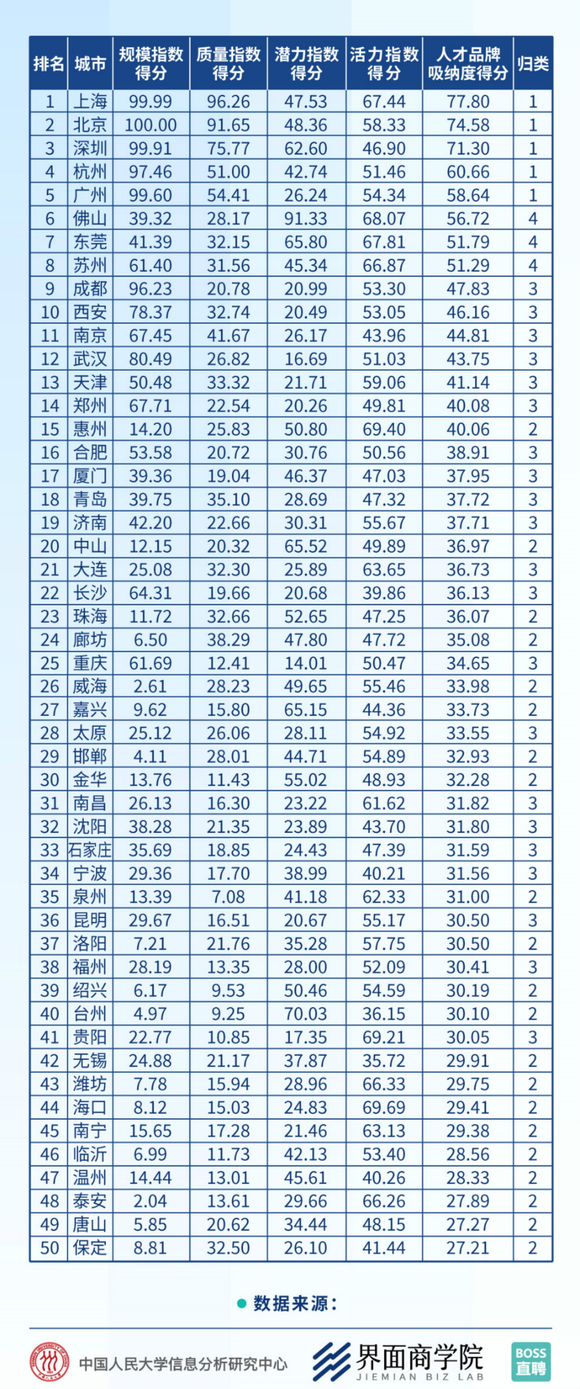 报告显示,在2019城市人才品牌吸纳度50强中,排名前十的城市依次为上海、北京、深圳、杭州、广州、佛山、东莞、苏州、成都、西安。