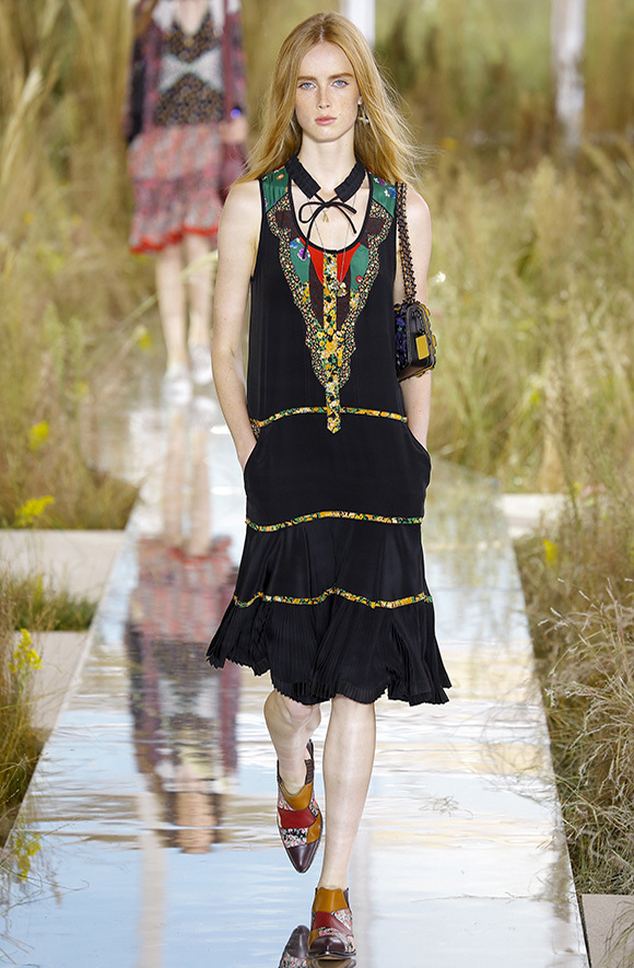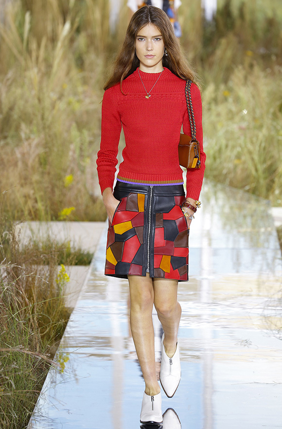Coach整个发布会的秀场,被布置成了杂草丛生的荒原,T台的镜面质地有点像湖面;身穿碎花雪纺衬衫和鱼尾裙的模特披上了拼接皮革外套,亦媚亦刚,真想唤一声小野猫。