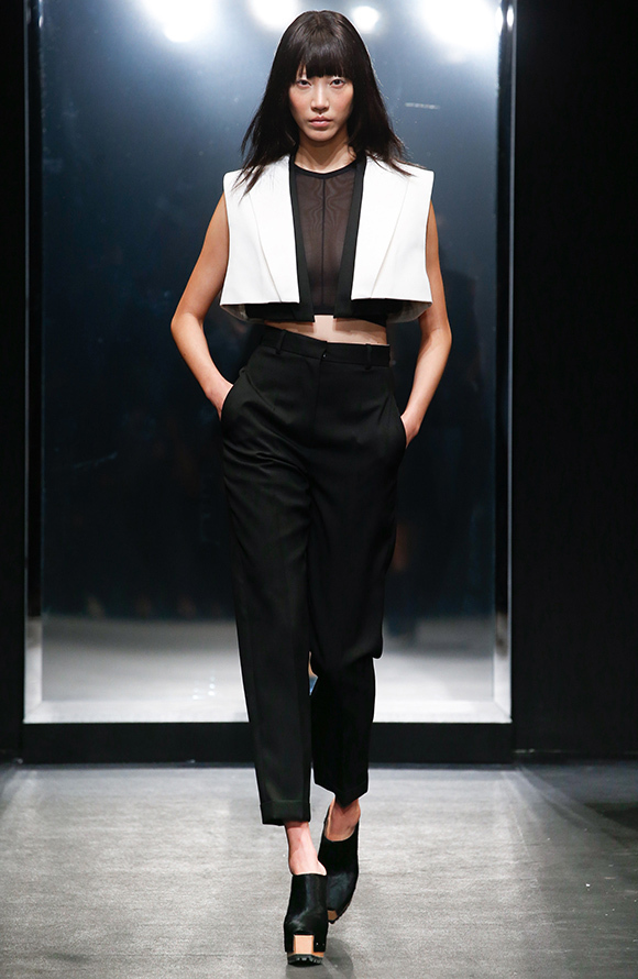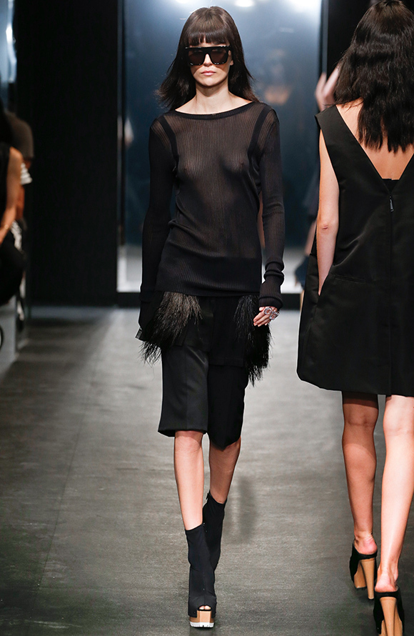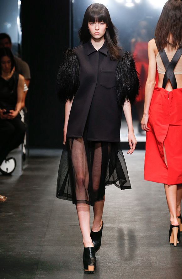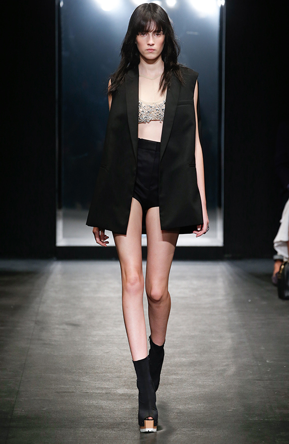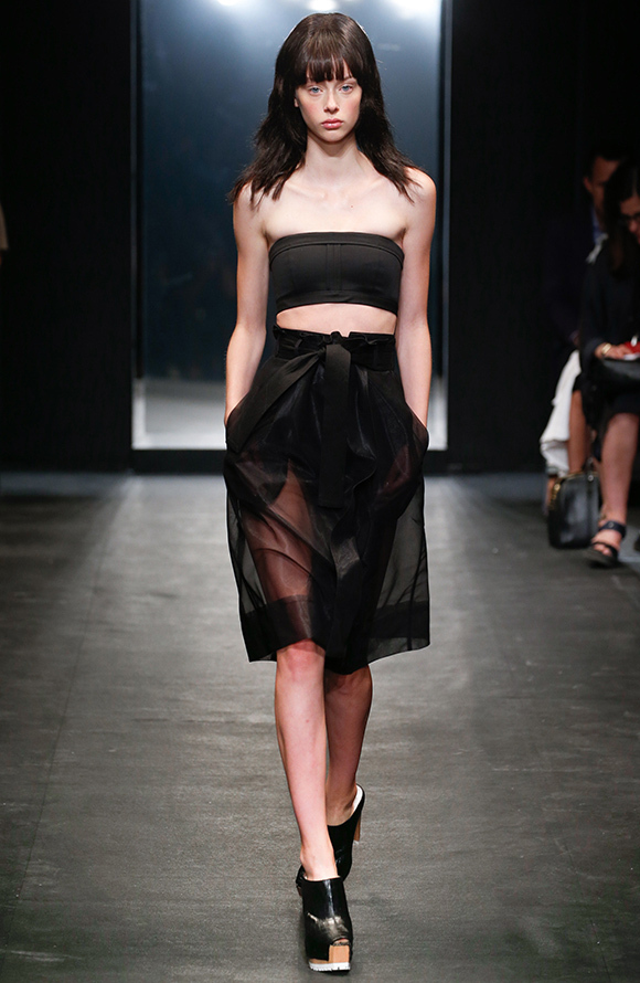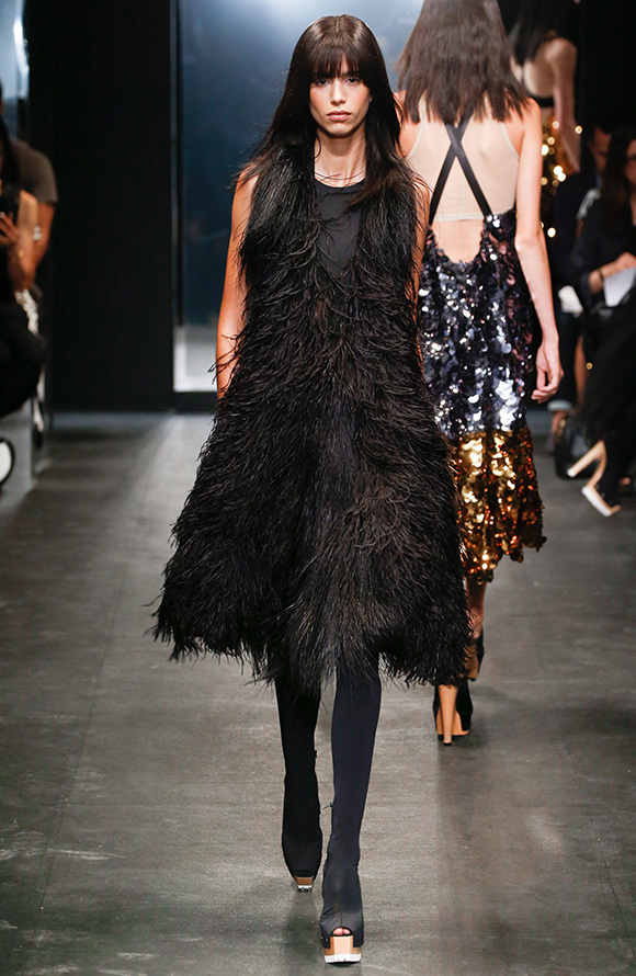 在这个秀场上,走得是模特们的层次感颓废刘海、透视装、运动抹胸加百褶裙——这种既乖巧又寻求刺激的都市女孩模样,相当地Vera Wang。