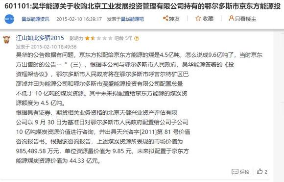 界面新闻记者注意到,有投资者在2015年昊华能源《收购公告》发出当日就发现了错误。该投资者发帖称,“昊华的公告数据有问题,京东方拟配给给京东方能源的煤是4.5亿吨,怎么说成9.6亿吨了?”同时,该投资者贴出了京东方2011年的出售公告。