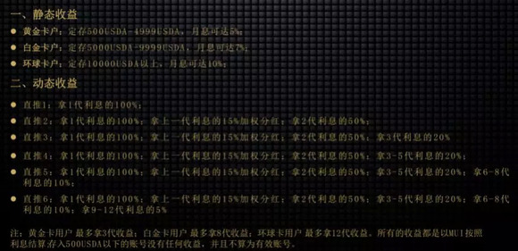 其中,投资500-4999美元的黄金卡用户,最多拿3代收益;投资5000-9999美元的白金卡用户,最多拿8代收益;投资10000美元以上的环球卡用户,最多拿12代收益。