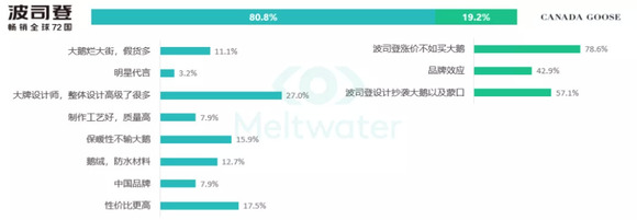 线上波司登的支持者占比80.8%,加拿大鹅仅为19.2%。产品的整体设计提升和高性价比,配合成为消费者愿意购买的主要因素。