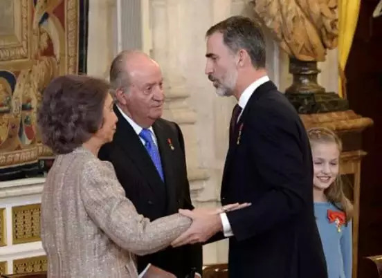 ▲授勋仪式中,老卡洛斯国王、现任国王费利佩六世以及莱昂诺尔公主均佩戴金羊毛骑士团勋章