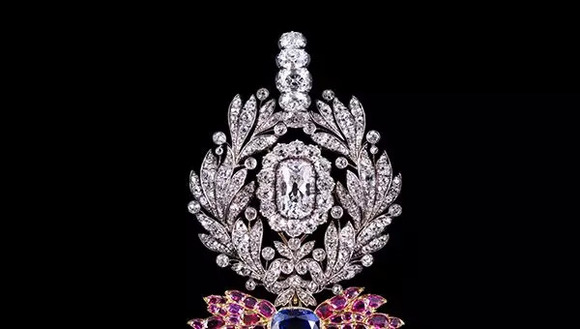 中间层的红宝石是法国皇室传统标志“金色的火焰”,象征普罗米修斯所盗取的圣火,火焰围绕着晶莹剔透的蓝宝石: