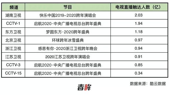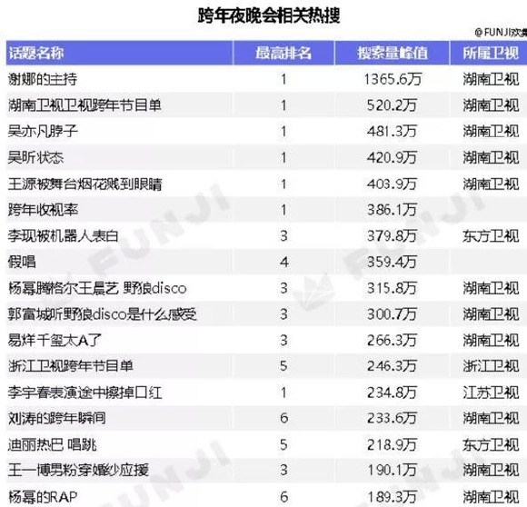 从热搜数据来看,据FUNJI(微博@FUNJI欢集)统计,截至2020年1月1日晚18:00,共有69条跨年夜晚会相关话题登上热搜,四大地方卫视晚会相关热搜中,湖南卫视共占31条,东方卫视共17条,江苏卫视共11条,北京卫视共3条。毒眸在云合热搜神器上统计发现,B站跨年夜晚会相关热搜共4条,可见在热搜数量上并不能与卫视抗衡。