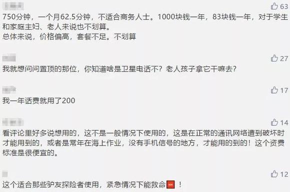 面对卫星电话的年套餐费用,有人从简单的数据计算后表示,价格偏高,套餐不足。满打满算,相当于1.33元/分钟。