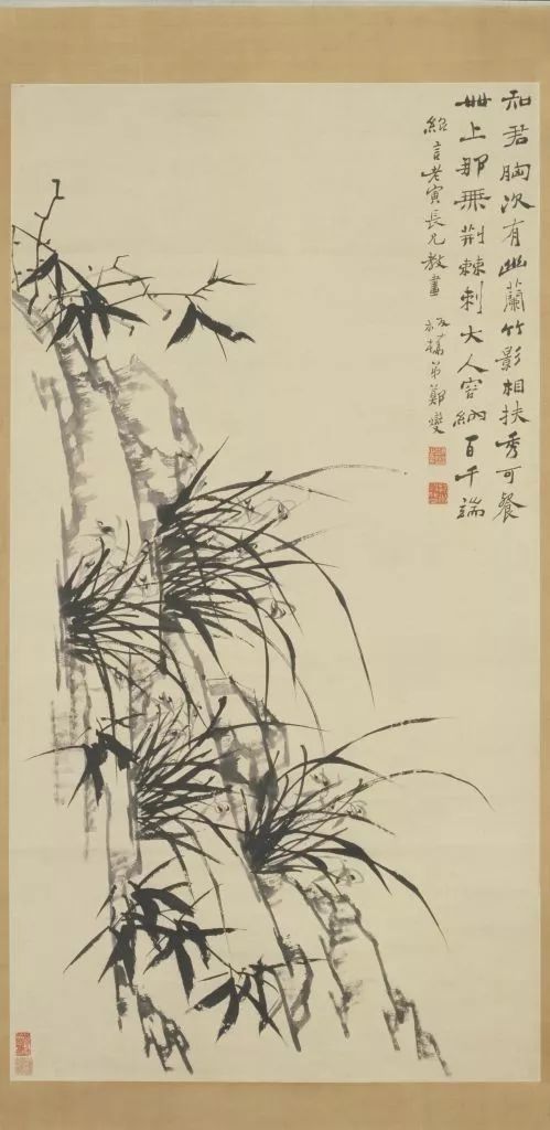 受到郑思肖画风影响的画家中以明代的朱耷、清代的郑燮最为有名。明清之际的朱耷原为明朝宗室,号“八大山人”“个山”等,明亡后隐于山野,后出入僧道。他的遗民身份及其心迹与郑思肖相似,想必也谙熟郑思肖的诗文与画作,故在创作上最易继承郑思肖的风格。朱耷绘画题材较广,令人印象深刻的莫过于一些举止怪异的禽鸟,孤零零地伫立画面中,以白眼示人,喻为对浊世的不屑。这种意境显然受到郑思肖诗句的启发,譬如:“对人有口不肯开,面仰虚空双眼白。”(《陷虏歌》)“白眼世无偶,青天路可阶。”(《即事八首》)朱耷自号的“八大山人”,今人皆知竖着连笔写,恰似“哭之笑之”,其构思也或与郑诗有关:“独笑或独哭,从人唤作颠。”(《遣兴二首》其一)