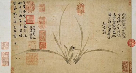 现存日本大阪市立美术馆的郑思肖《墨兰图》,该图右上角自题:“向来俯首问羲皇,汝是何人到此乡?未有画前开鼻孔,满天浮动古馨香。所南翁。”画面幽兰左有落款“丙午正月十五日作此一卷”,丙午为元成宗大德十年(一三○六)。年款下钤有两枚印章,一为阳文“所南翁”,一为阴文“求则不得,不求或与。老眼空阔,清风万古”。可知郑思肖作此画时已六十六岁。图左上角有元代苏州人陈深草书所题六言诗:“芳香渺无寻处,梦隔湘江风雨,翁是闲作楚花,我亦为翁楚舞。”右下角有清初藏家宋荦的藏印“商丘宋荦审定真迹”。此画后入清宫,有乾隆、嘉庆、宣统鉴藏图章。据杨仁恺《国宝沉浮录》揭露,此图由溥仪从宫中偷出后卖给日本人,遂流入东瀛,至今未归。