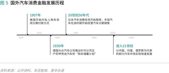 1908年,美国福特汽车推出的“分期付款购车模式”,美国成为世界上最早开始萌芽汽车消费金融业务的国家。1930年,德国大众推出“购车储蓄计划”,是欧洲首次推出汽车消费金融服务。20世纪50年代,日本以丰田汽车为代表开始经营汽车分期销售。21世纪以来,中国、印度、俄罗斯为代表的的新兴汽车市场的消费金融逐步迅速发展。