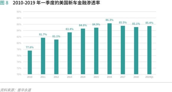 根据Statista网站统计,1998年至2018年,美国汽车销量从1544.3万辆增长到1721.4万辆,年均复合增长率约为0.5%,可见美国的汽车销量近年来基本处于稳定发展的趋势。美国新车金融渗透率在2010-2016年一直稳步上升,2017年至2019年Q1基本保持在85%-86%之间,美国的汽车消费金融渗透率已经较为稳定,汽车消费金融市场较为成熟。