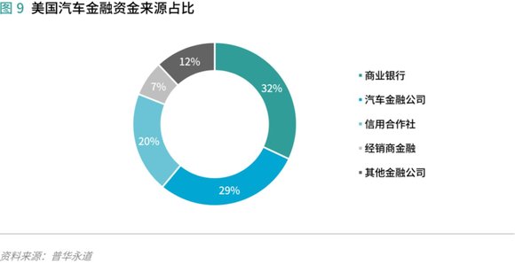 从美国汽车消费金融的资金来源来看,32%来自商业银行贷款,29%来自汽车金融公司,20%来源于信用合作社,7%为经销商金融服务公司,12%来自其他金融公司。