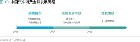 我国汽车消费金融大致经历了三个发展阶段。第一阶段为1996年至2004年摸索阶段,主要参与主体为汽车厂商财务公司,发展目的是促进汽车销售,主要模式是厂商贴息卖车。第二阶段为2004年至2014年的缓慢发展阶段,主要参与主体为商业银行和汽车金融公司,汽车消费金融市场逐渐成型。第三阶段为从2015年至今的爆发阶段,融资租赁等新玩家迅速崛起,再加上利好政策不断,各路资本纷纷进入,汽车金融格局被重塑,商业银行、汽车金融公司、融资租赁公司形成三足鼎立的新格局。