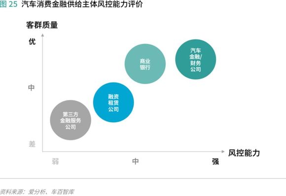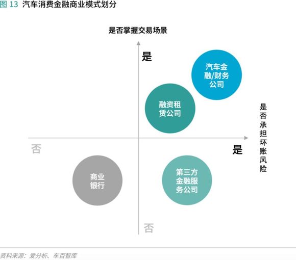 从风险管理的角度出发,按是否承担坏账风险和是否掌握交易场景来看,商业银行既不掌握交易场景也不承担坏账风险,由于控制着资金供给端,商业银行在产业链中处于强势地位,通常会让渠道方兜底坏账;汽车金融公司、汽车集团财务公司掌握4S店渠道,掌握交易场景,同时需承担坏账风险;融资租赁公司掌握交易场景,同时承担坏账风险;第三方汽车金融服务公司是纯粹的金融服务方,一般不掌握交易场景,但是需承担坏账风险。