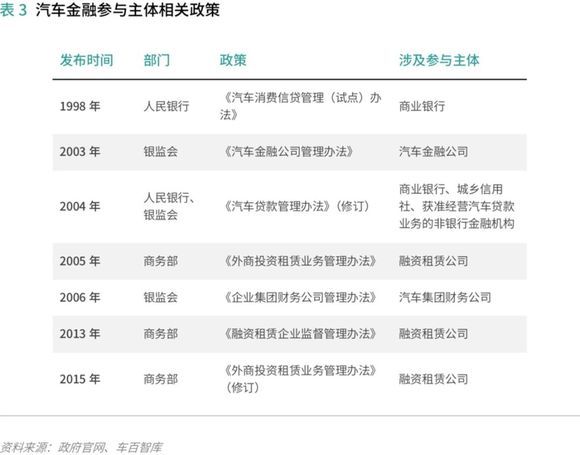 1998年,中国人民银行颁布实施《汽车消费信贷管理(试点)办法》,完善了汽车消费金融行业监管政策。随着乘用车销量的急速增长,汽车消费贷款额也呈现出较快的增长态势,从1999年的4亿元增长至2003年的1839亿元。汽车消费信贷的主体也随之扩大,从国有银行主导转向股份银行。但由于试点办法将汽车信贷资质局限于商业银行,当时商业银行垄断了汽车信贷市场。