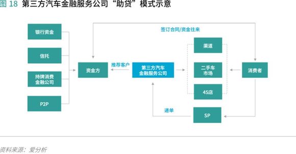 以上三类主体都是持牌经营玩家。汽车消费金融行业还有一类公司,自身并无放贷资质,是以助贷模式开展汽车消费金融业务,被称为“第三方汽车金融服务公司”。第三方汽车金融服务公司往往通过经销商、4S店、融资租赁公司等渠道间接为消费者提供汽车贷款,为“B2B2C”模式。