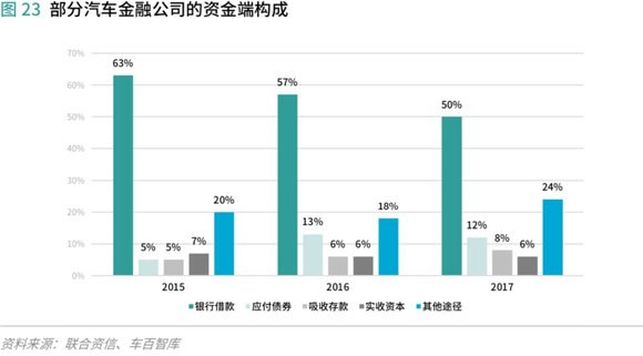 在资金供给方面,各汽车消费金融参与主体可通过股东存款、银行贷款、发行债券、信托、P2P等方式筹措资金。自2016年国家发布《国务院关于积极稳妥降低企业杠杆率的意见》政策以来,银行、信托、民间P2P资金逐步收紧,导致汽车消费金融市场融资成本上涨。