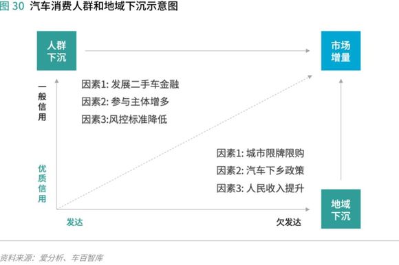 人群下沉和地域下沉是驱动汽车消费金融市场增长的重要推力。在人群下沉方面,从我国汽车消费金融发展历程来看,伴随汽车消费金融参与主体逐步增多,行业对坏账的忍受程度逐步增加,风控标准相对降低,因此早期贷款买车的消费者信用相对较优;而近几年兴起的“1成首付”、“0首付”的融资租赁产品,降低购车门槛,是为了满足信用资质一般的群体买车的需求。人群下沉的另一个体现是二手车金融渗透率的上升,整体而言二手车消费人群的收入和信用状况不如购买新车人群,而二手车的金融渗透率远低于新车,二手车金融渗透率逐步提升的过程也是汽车消费金融人群下沉的表现。